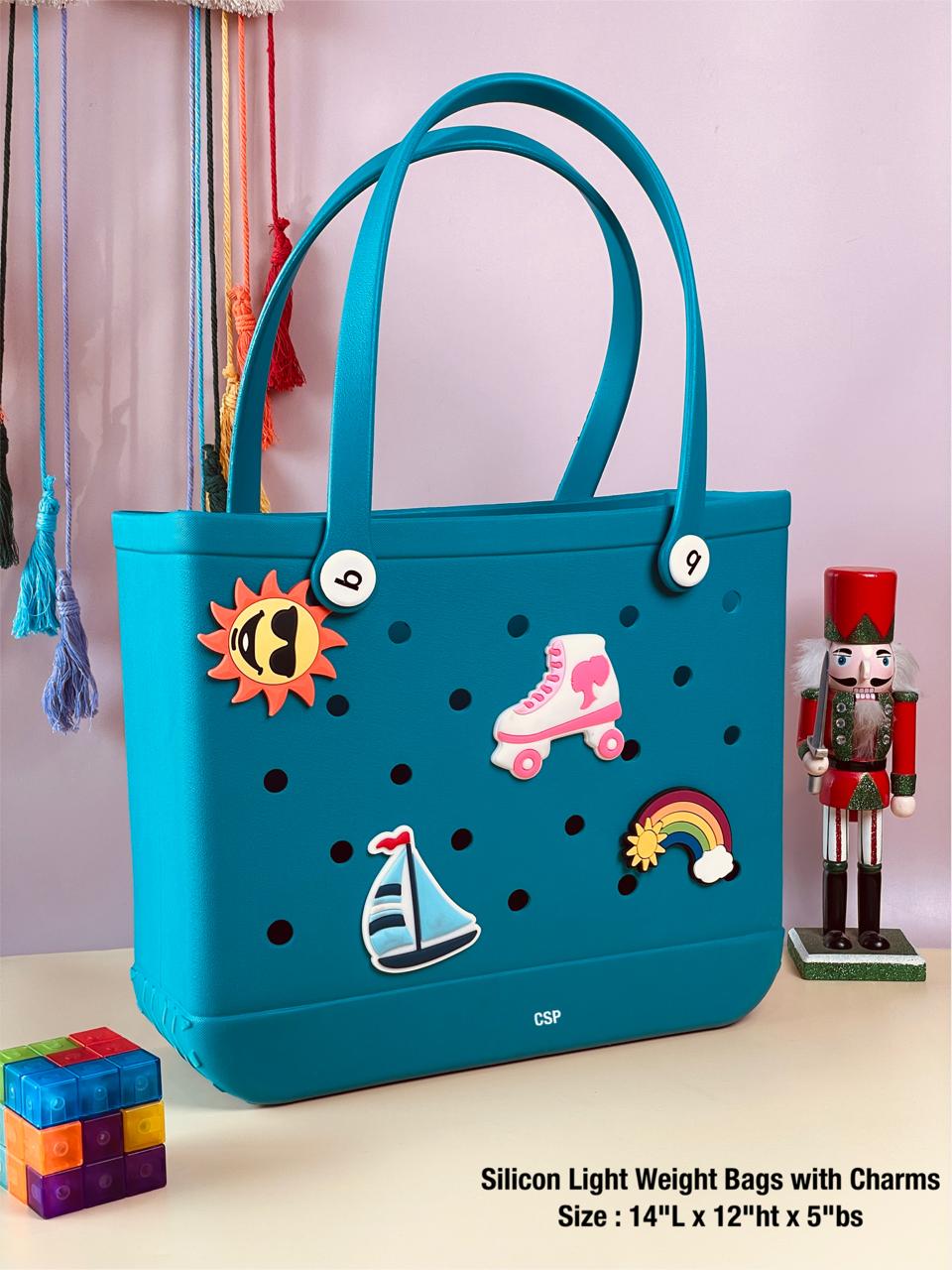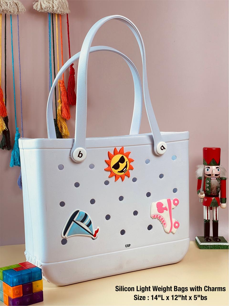 Designed to be lightweight and water-resistant, the Charm Pop Silicone Tote Bag is perfect for shopping, travel, beach days, or casual outings. The spacious interior easily fits your daily essentials—from phone and wallet to cosmetics and more—while the sturdy handles ensure comfortable carry all day long.