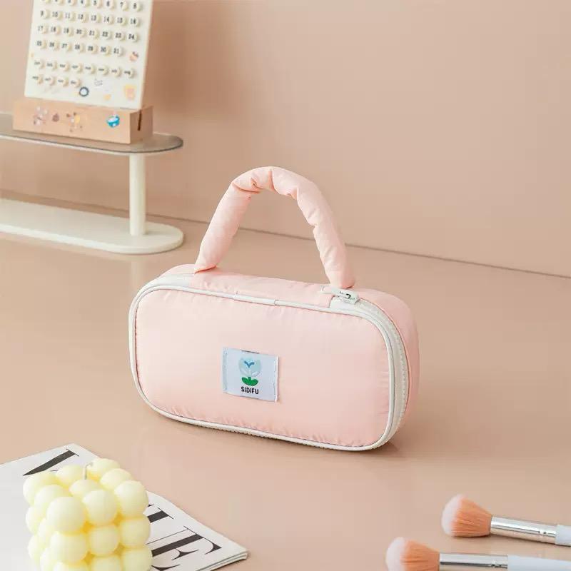 Crafted from durable, lightweight material, the pouch protects your belongings while maintaining a soft, modern pastel look. The smooth zip closure ensures your items stay secure, while the handy top handle allows for easy carrying or quick access from bags, backpacks, or luggage.