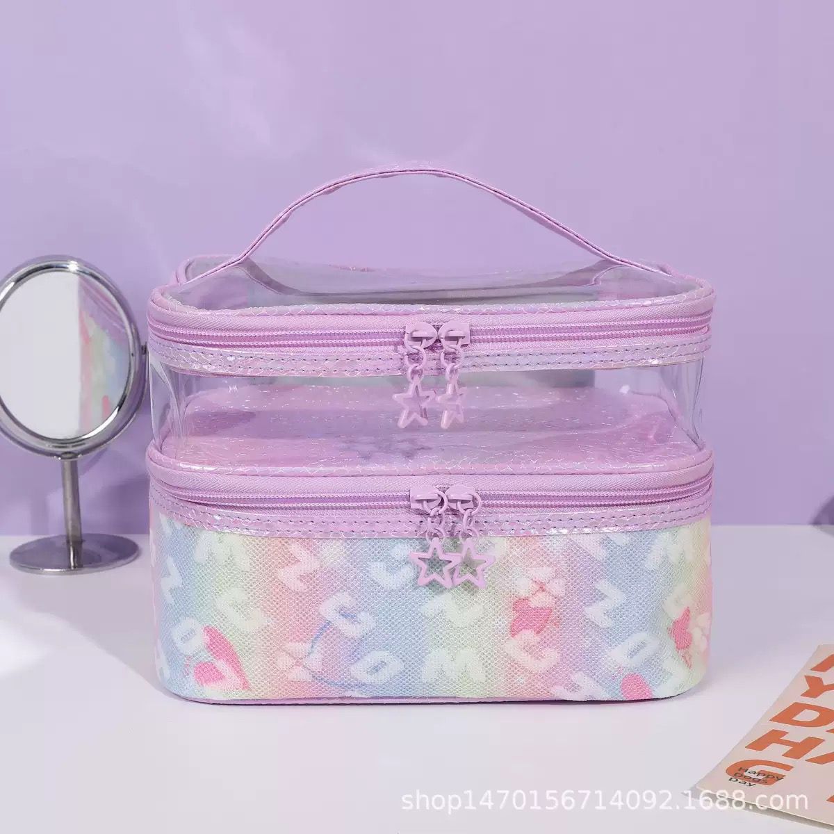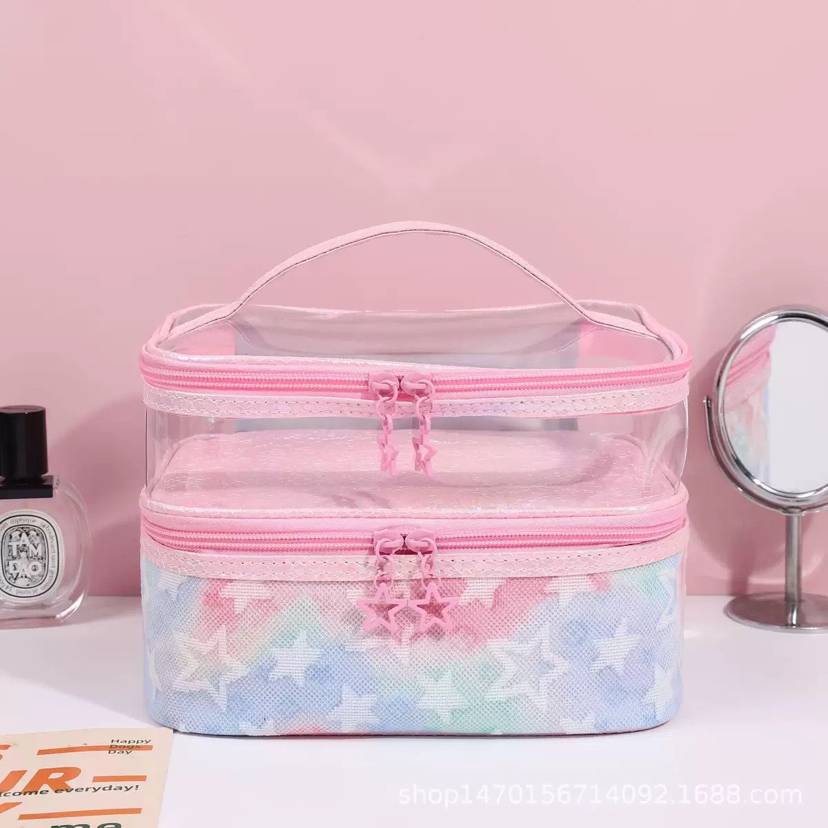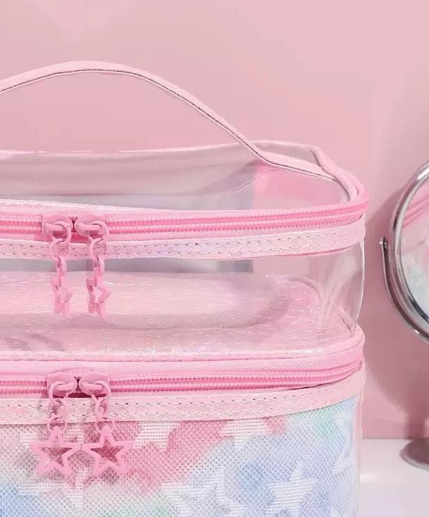 Upgrade your beauty storage with this Pastel Star Transparent Vanity Makeup Organizer, designed for style lovers who adore cute aesthetics with smart functionality. This elegant vanity case combines a clear top design with a soft pastel star-patterned base, making it both visually appealing and extremely practical for everyday use and travel.