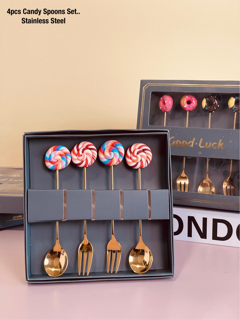 A cute 4-piece spoon and fork set in fun donut and candy designs for joyful everyday dining.